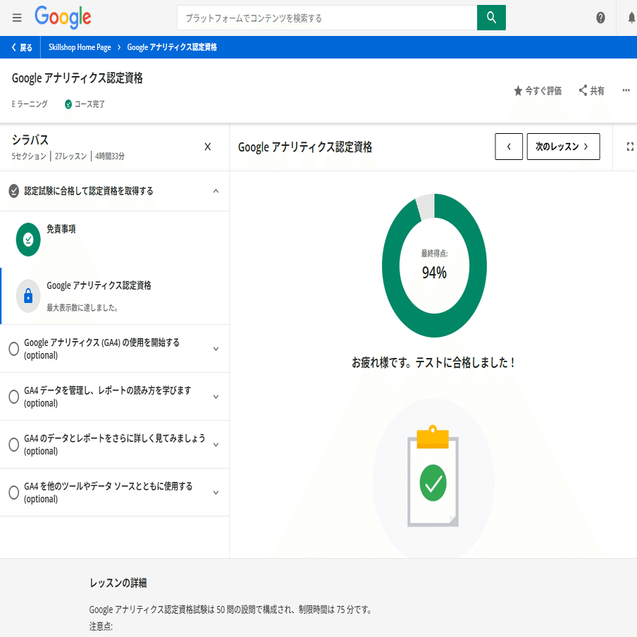 (スキルショップ Google 広告「Google アナリティクス」認定資格)